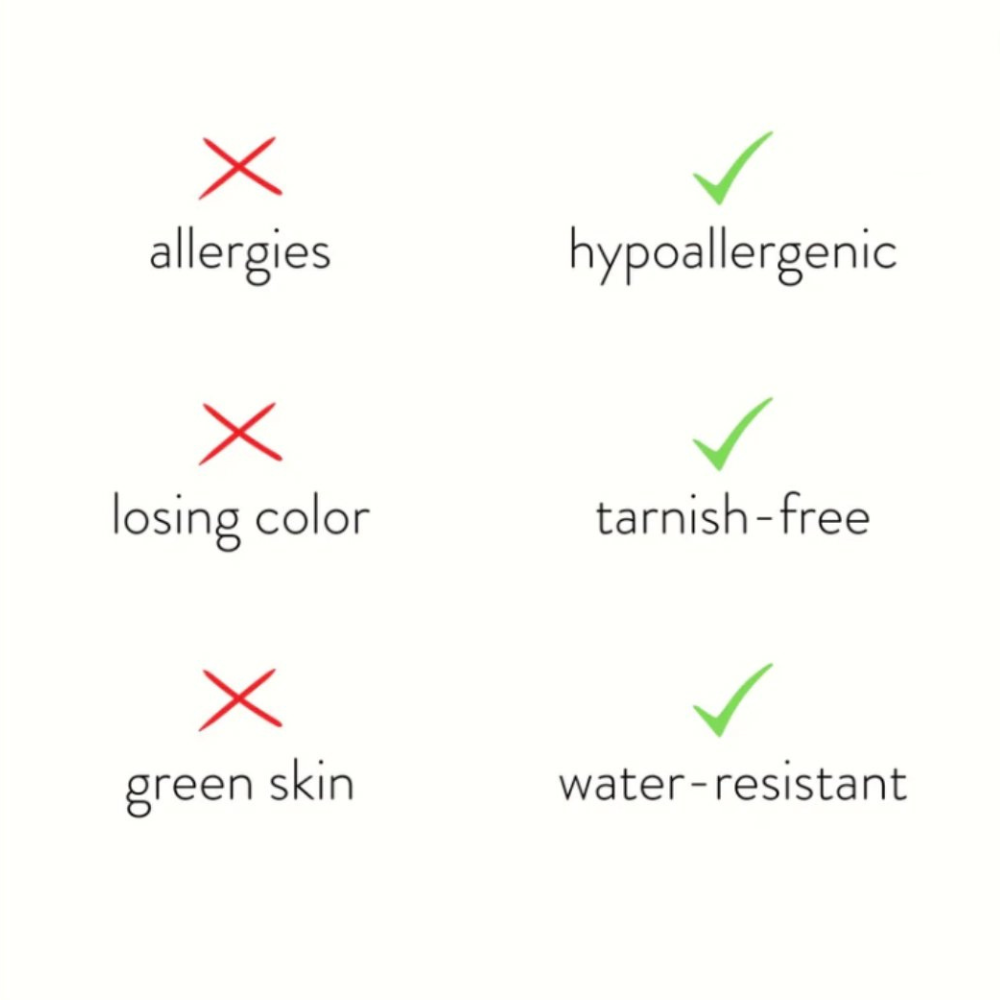 Waterproof & tarnish-resistant, stainless steel, 18K gold-plated, hypoallergenic, lead-free & nickel-free.