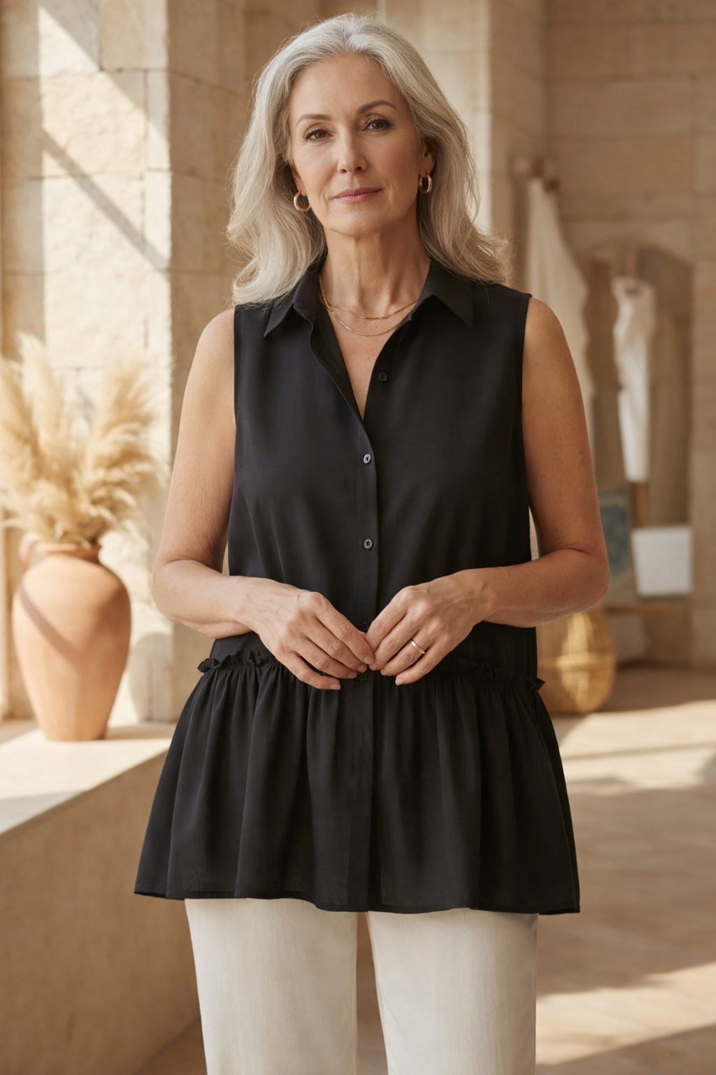 • ✓ Sleeveless Button-Down Front: A relaxed yet polished style that’s easy to throw on and layer up.